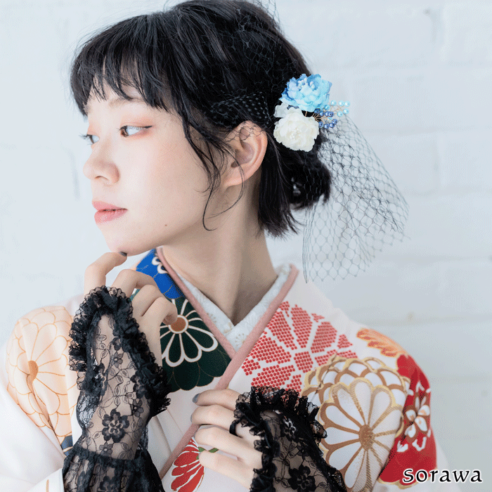 (お花のかんざしは別売りです)上の画像でつけているかんざし: ss-sbk-01b 上の画像でつけている手袋: ss-hs-011b お手持ちの髪飾りやリボンとの重ね付けで、いっそう自分らしく華やかなコーディネートが楽しめます。