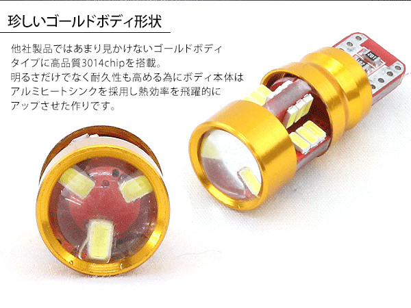 T10/T16 LEDバルブ ゴールドボディ アルミ 12V専用 2個セット 拡散タイプ 保証付き ポジション球 バックランプ ルームランプ ナンバー灯 ライセンスランプ